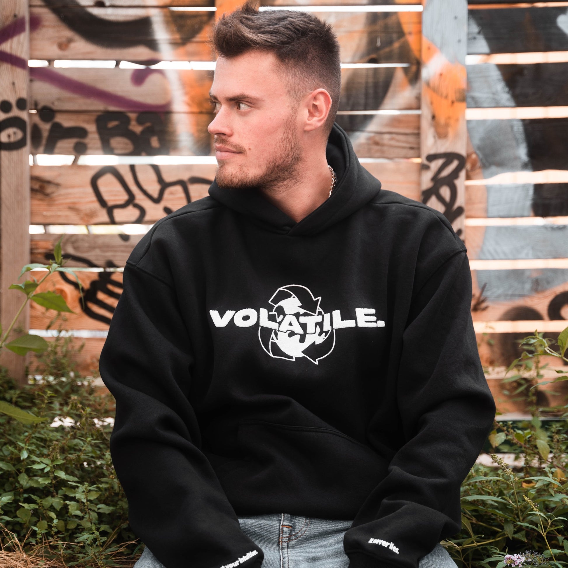 FRONT _ volatile. Schriftzug in besonderem Frottee Stick & Logo in Stick